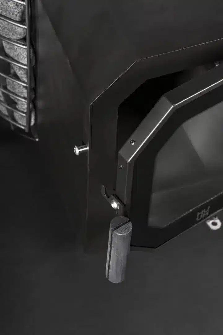 The large glass furnace door enhances the cozy ambiance of your sauna, letting you enjoy the mesmerizing flames, much like a small fireplace.