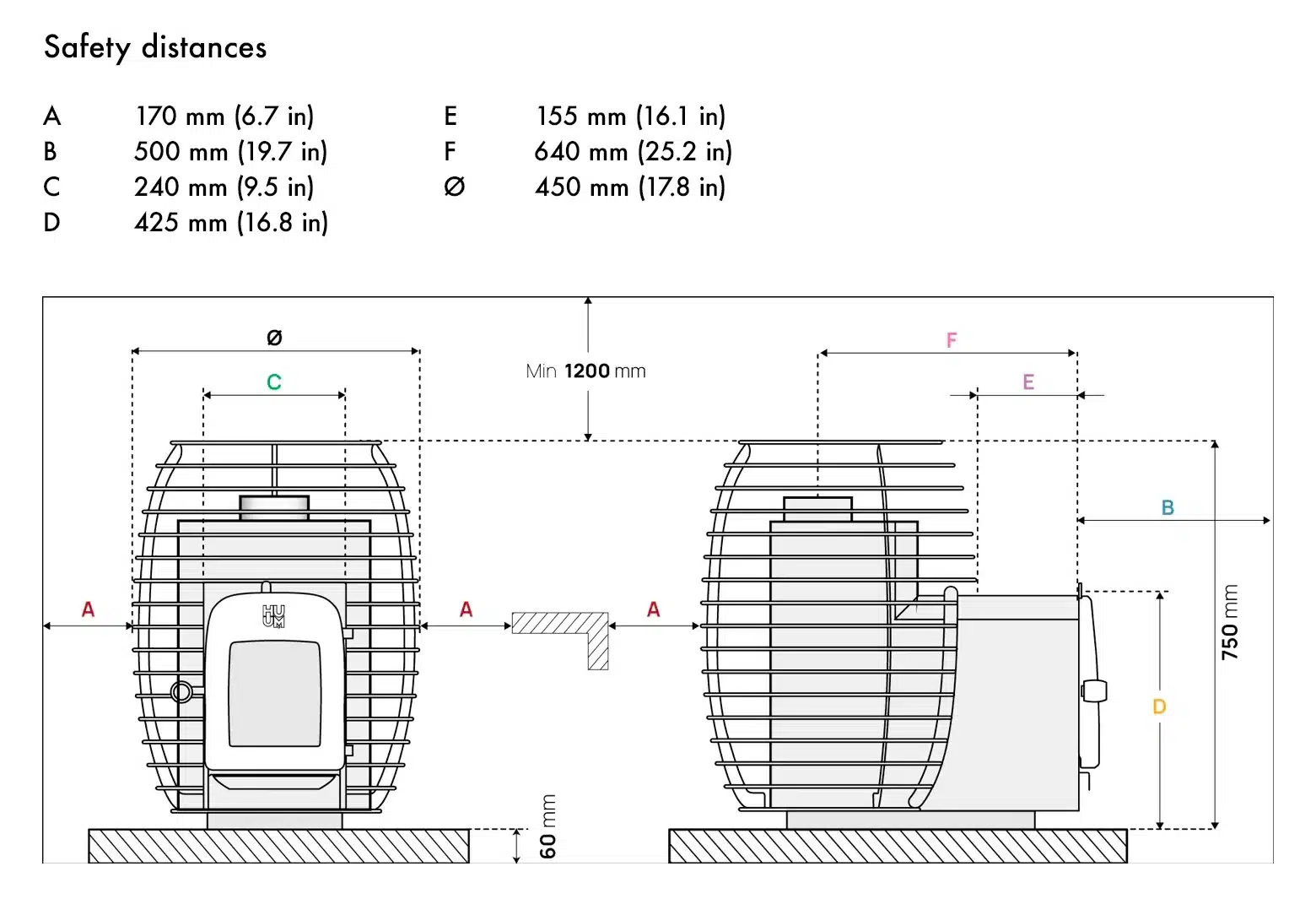 Safety distances: Please see the Drawing tab below.
